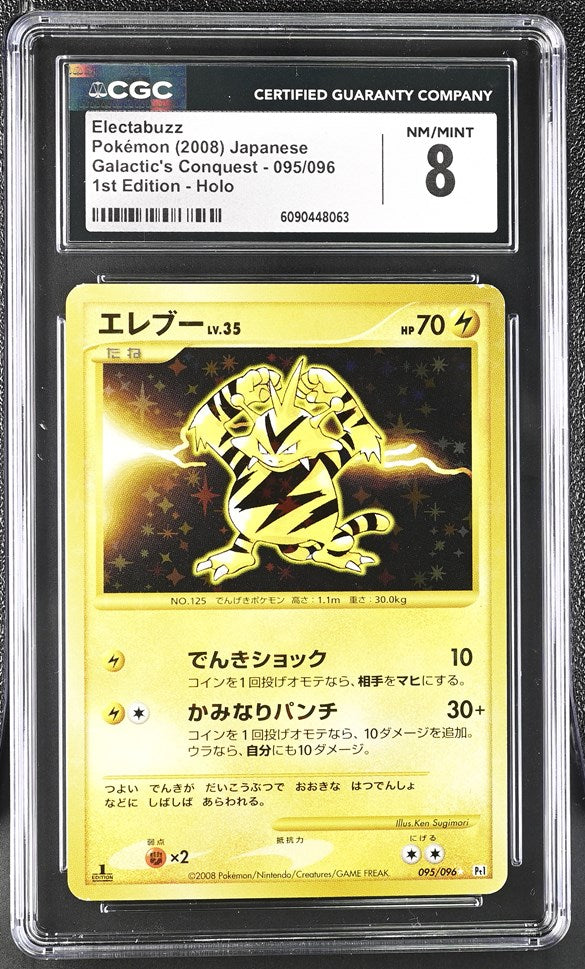 This listing is for a CGC 8 Electabuzz Pokémon 2008 Japanese Galactic's Conquest - Pt1 095/096 1st Edition Holo