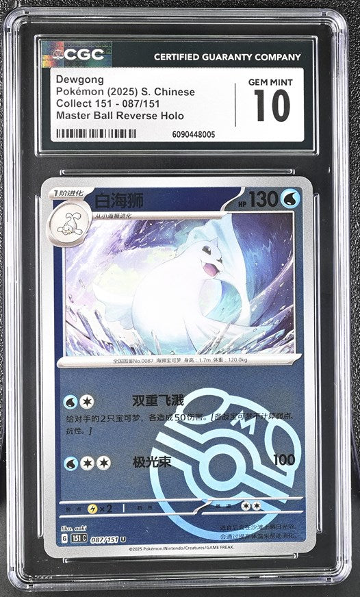 This listing is for a CGC GEM 10 Chinese Dewgong Pokémon 2025 Simplified Chinese Collect 151 - 151 C 087/151 Master Ball Reverse Holo