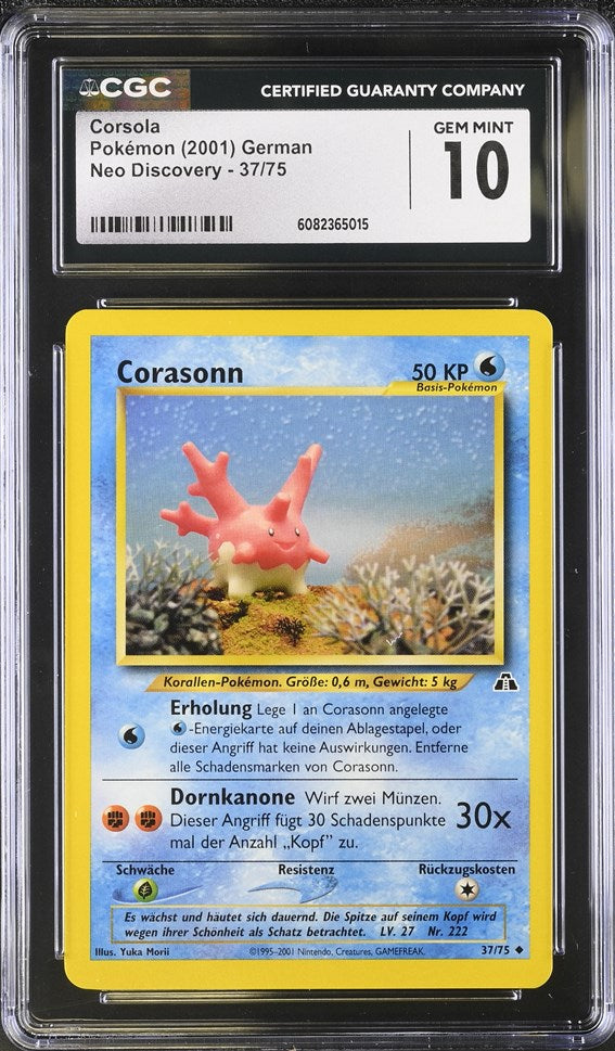 This listing is for a CGC GEM 10 German Corsola Pokémon 2001 German Neo Discovery - Unlimited 37/75.