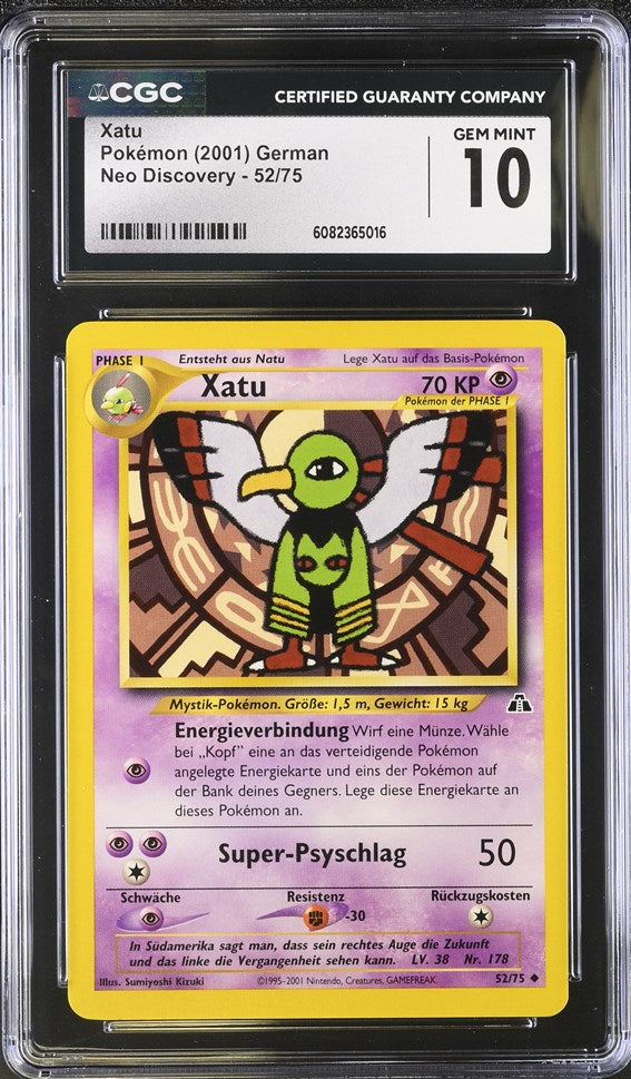 This listing is for a CGC GEM 10 German Xatu Pokémon 2001 German Neo Discovery - Unlimited 52/75.