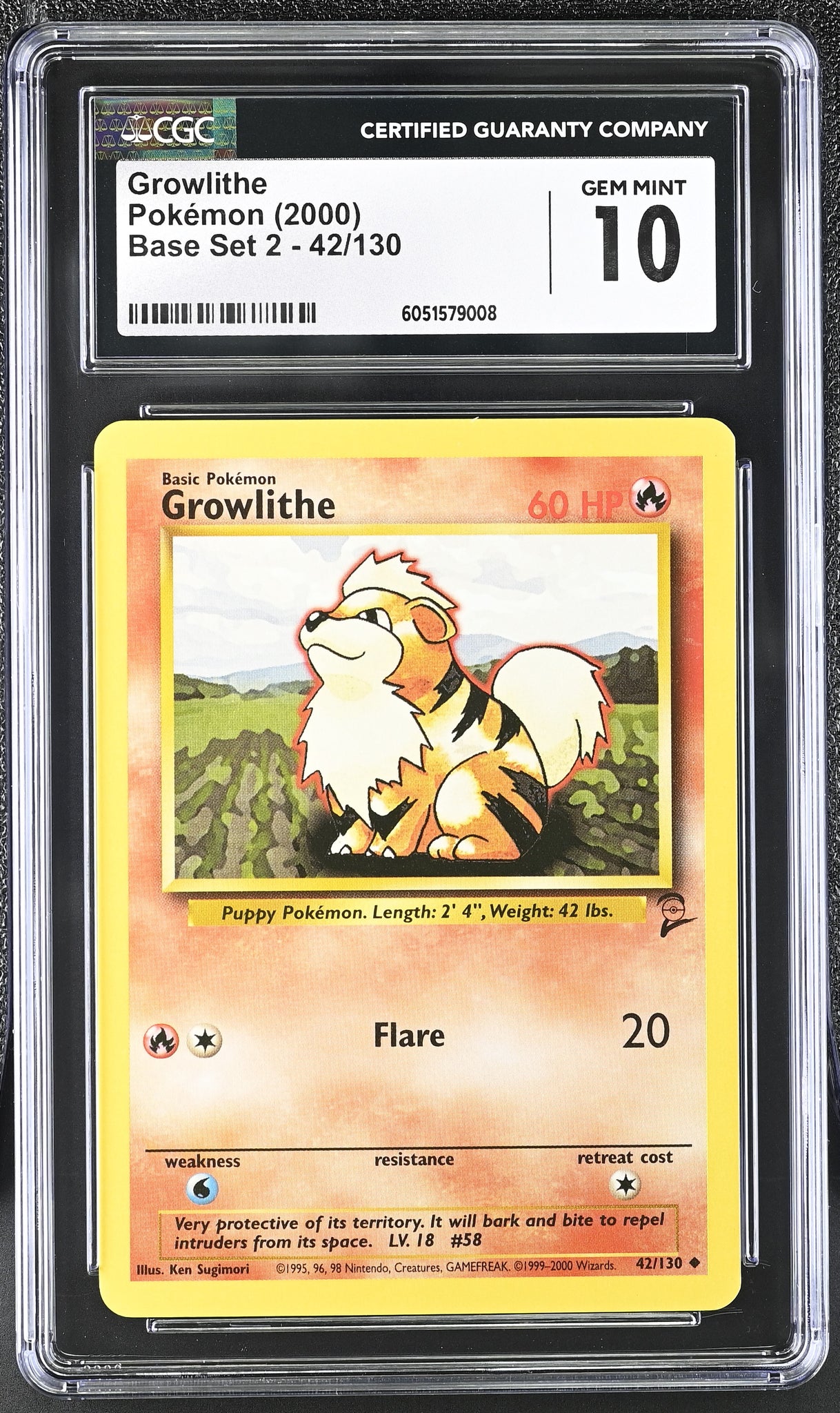 This listing is for a CGC GEM 10 Growlithe Uncommon from 'Base Set 2'.