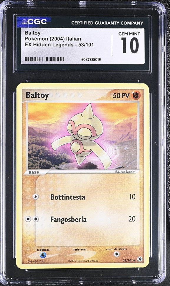This listing is for a CGC GEM 10 Italian Baltoy Pokémon 2004 Italian EX Hidden Legends 53/101.