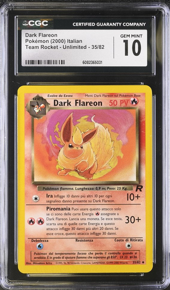 This listing is for a CGC GEM 10 Italian Dark Flareon Pokémon 2000 Italian Team Rocket - Unlimited 35/82.