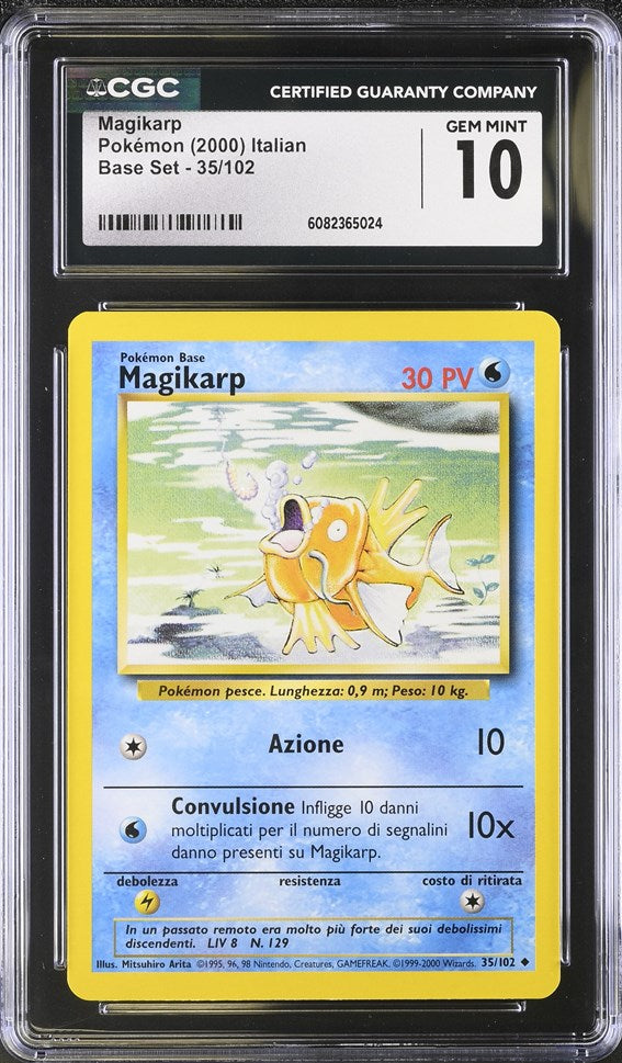 This listing is for a CGC GEM 10 Italian Magikarp Pokémon 2000 Italian Base Set - Unlimited 35/102.