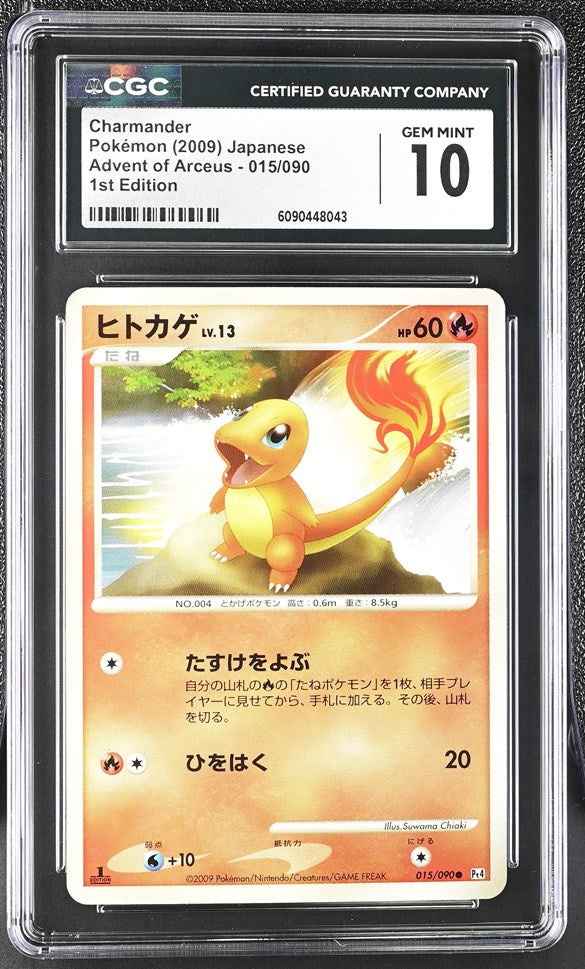 This listing is for a CGC GEM 10 Charmander Pokémon 2009 Japanese Advent of Arceus - Pt4 015/090 1st Edition