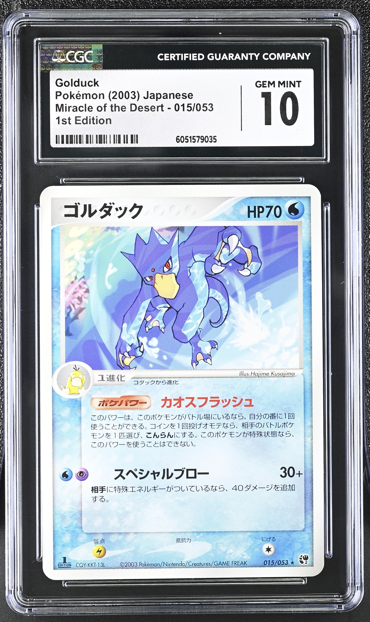This listing is for a CGC GEM 10 Japanese Golduck Rare 1st Edition from 'Miracle of the Desert'.