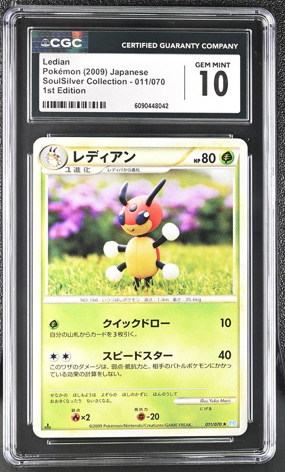 This listing is for a CGC GEM 10 Ledian Pokémon 2009 Japanese SoulSilver Collection - L1 (Blue) 011/070 1st Edition Rare