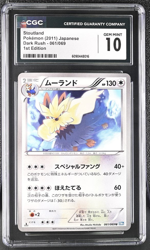 This listing is for a CGC GEM 10 Stoutland Pokémon 2011 Japanese Dark Rush - BW4 061/069 1st Edition