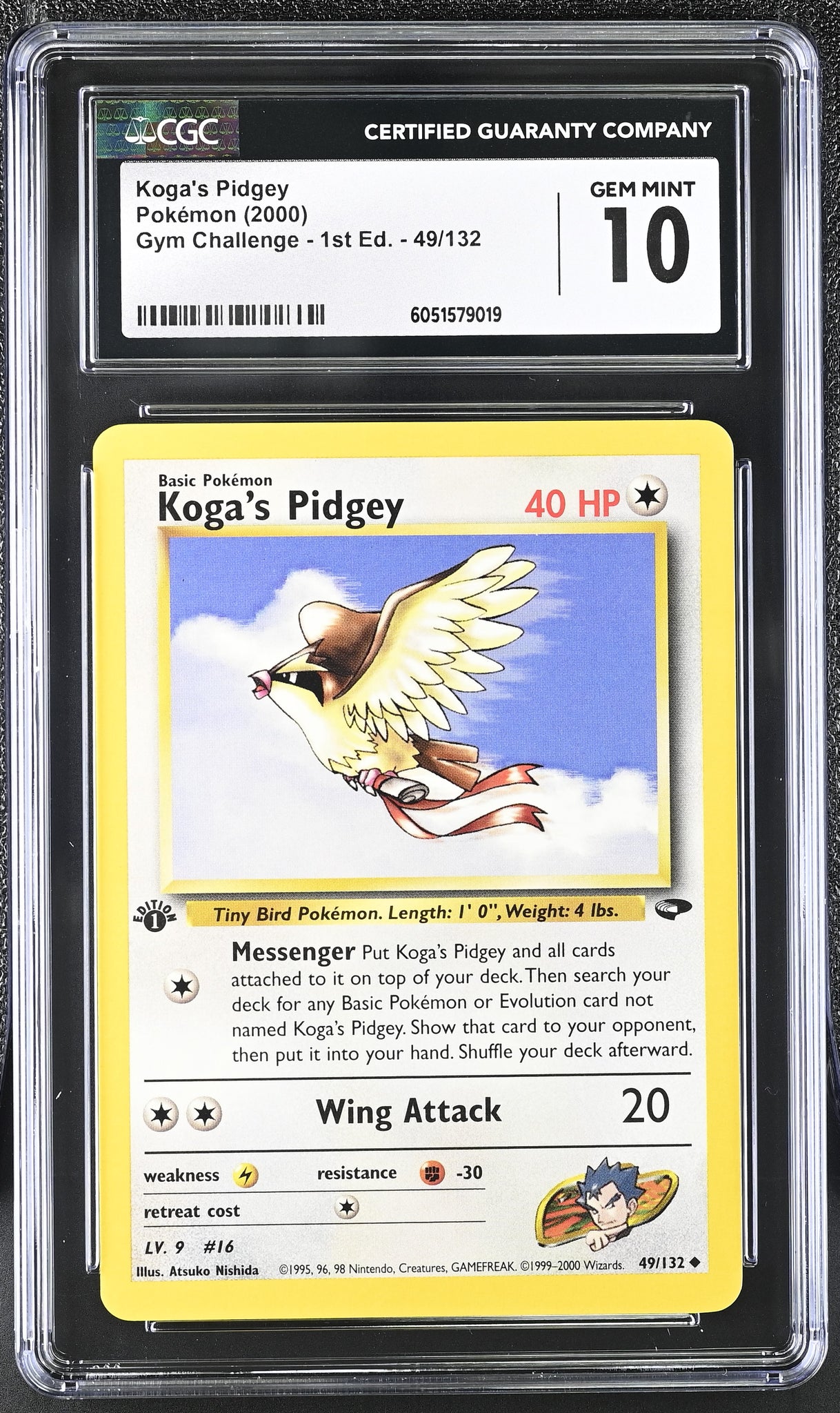 This listing is for a CGC GEM 10 Koga's Pidgey 1st Edition from 'Gym Challenge 1st Edition'.
