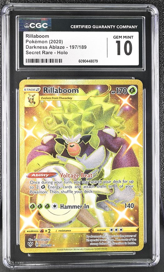 This listing is for a CGC GEM 10 Rillaboom Pokémon 2020 English Darkness Ablaze 197/189 Secret Rare Holo