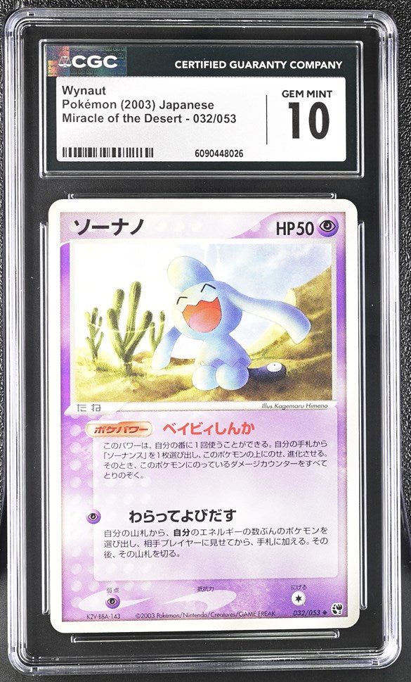 This listing is for a CGC GEM 10 Wynaut Pokémon 2003 Japanese Miracle of the Desert 032/053