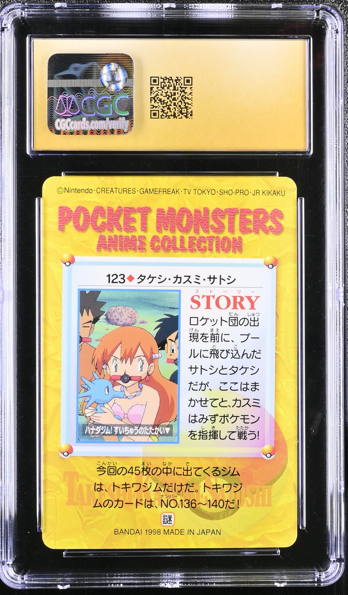 This listing is for a CGC PRISTINE 10 Japanese Brock, Misty, and Ash Friends Card from Bandai Carddass Anime Series - 123.