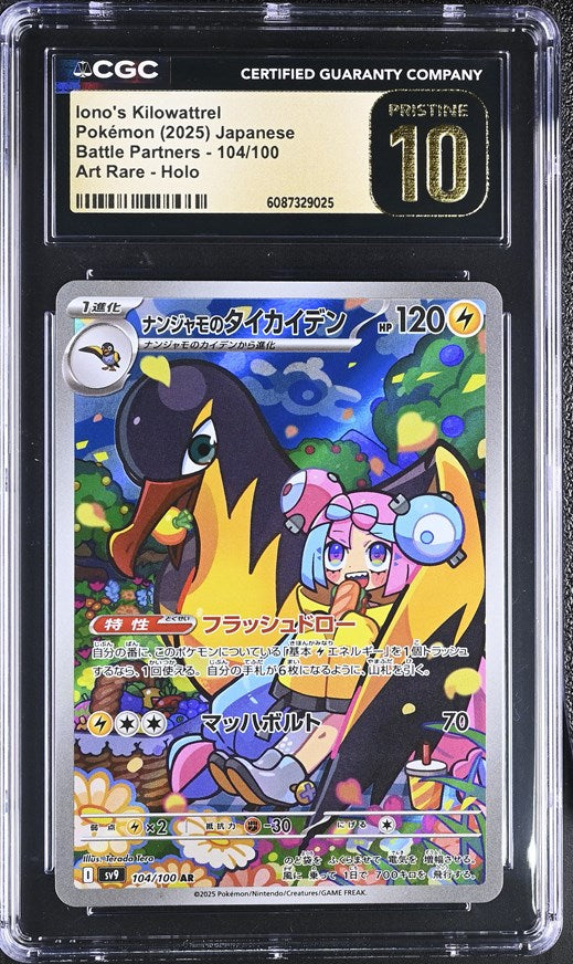 This listing is for a CGC PRISTINE 10 Iono's Kilowattrel Pokémon 2025 Japanese Battle Partners - sv9 104/100 Art Rare Holo.