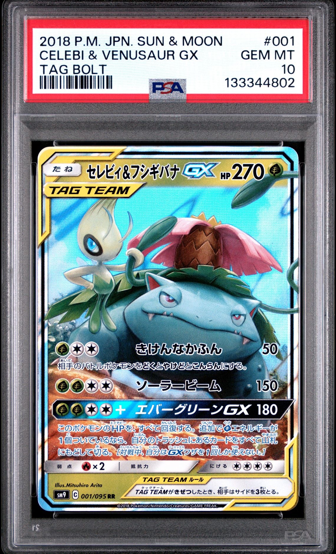 This listing is for a PSA 10 Japanese Celebi & Venusaur GX from 'Tag Bolt'.