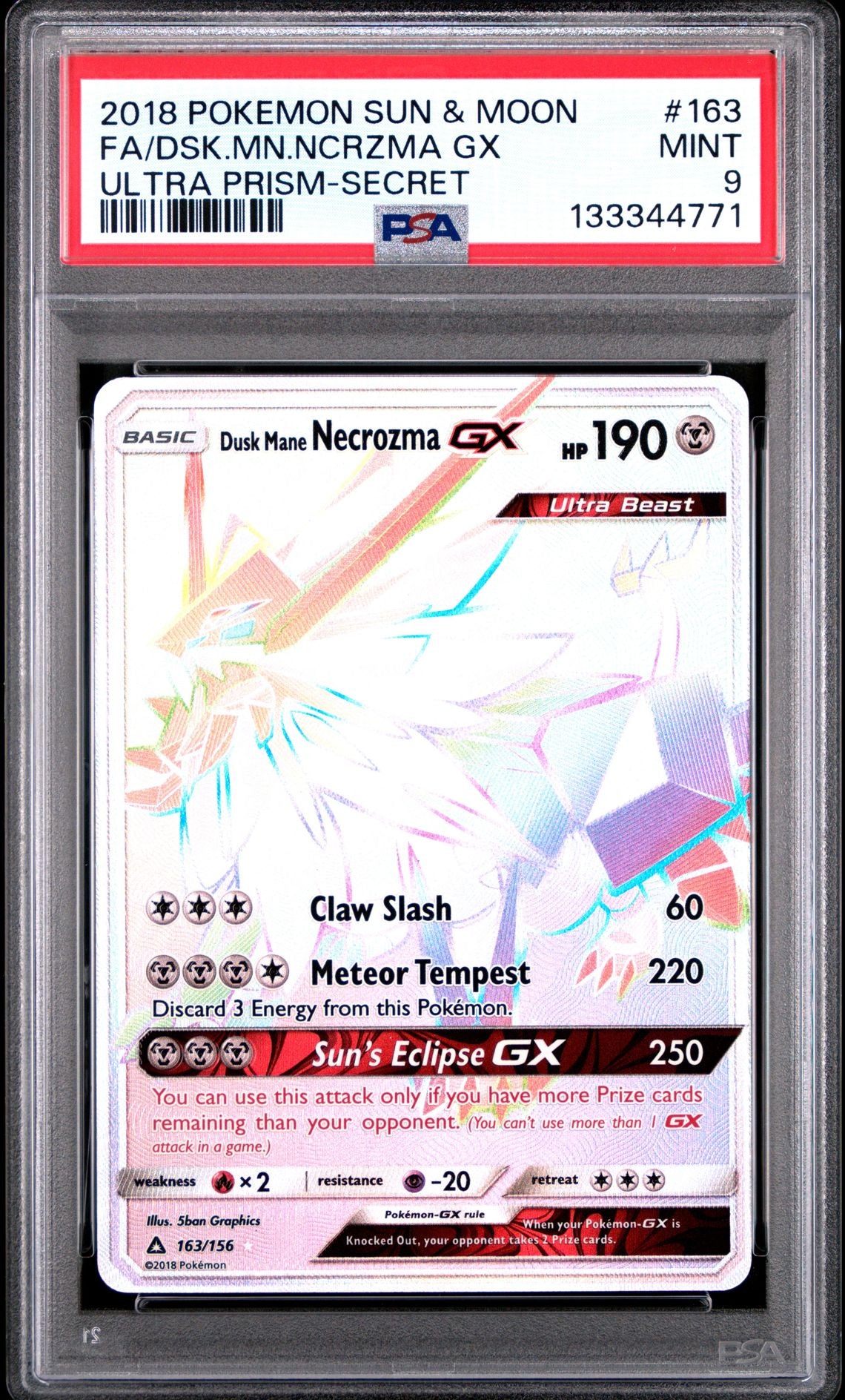 This listing is for a PSA 9 Dusk Mane Necrozma GX Rainbow Secret from 'Ultra Prism'.