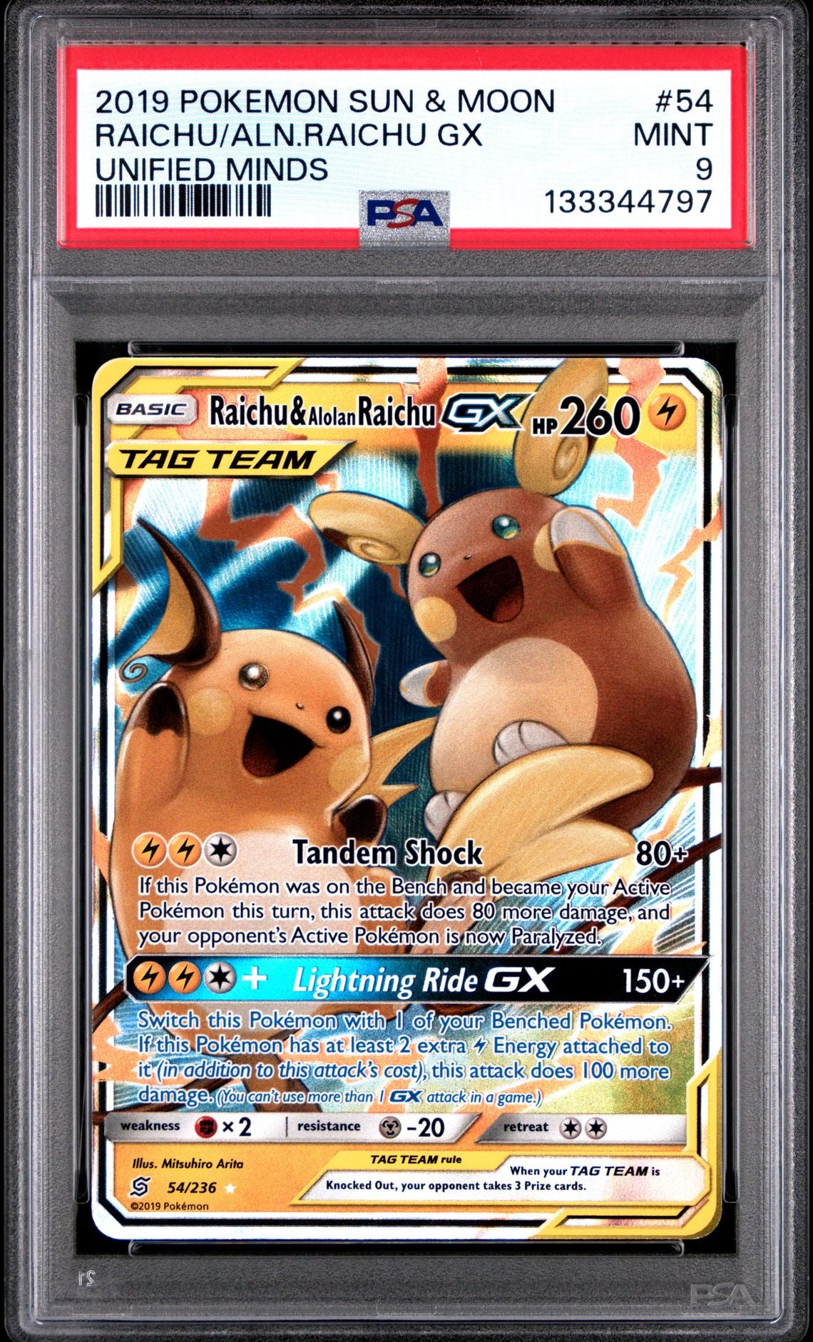 This listing is for a PSA 9 Raichu & Alolan Raichu GX from 'Unified Minds'.